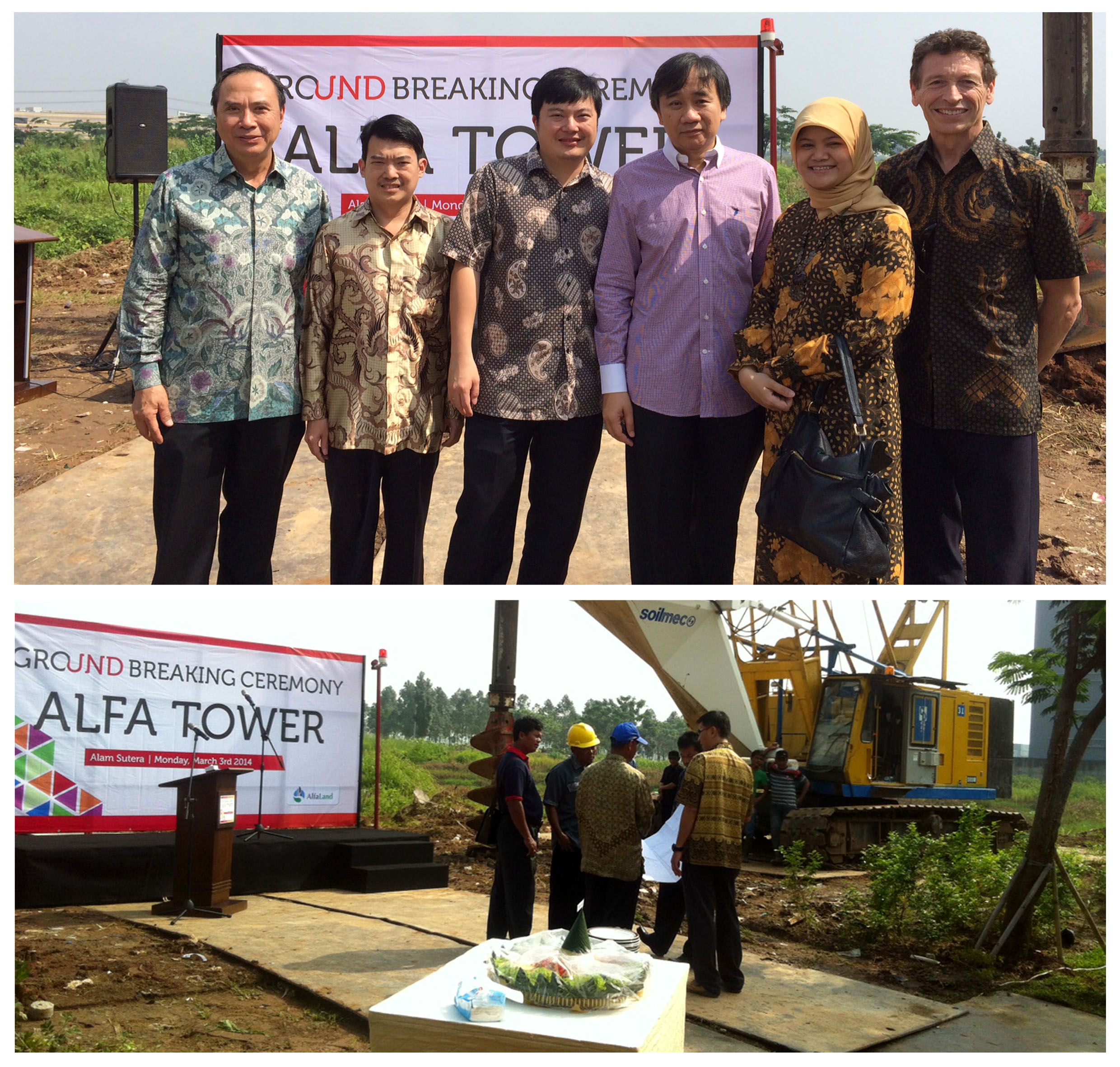 ALFA Tower breaks ground on the 3rd of March 2014 at Alam Sutera. Standing from left to right are the owners, Mr. Djoko Susanto, Mr. Hanto Susanto and Mr. Harryanto Susanto, and the PTI team led by Doddy Tjahjadi, Managing Director, Shakuntala Kartika, Associate and Stephen Stinton, Design Director.
