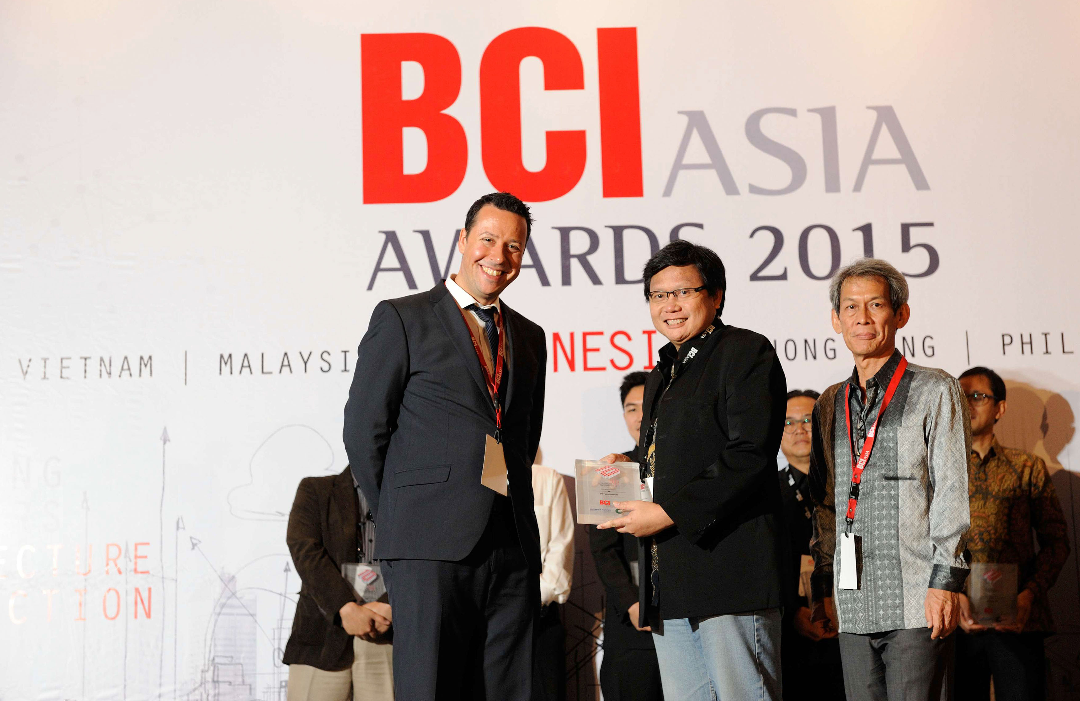 Since 2005 when BCI Asia first started the selection of the Top Ten Architects from seven Asian countries, namely; Hong Kong SAR, Indonesia, Malaysia, the Philippines, Singapore, Thailand and Vietnam, PTI Architects has consistently been included on the list every year. It is with great honor and pride that Mr. Aditya Wirawan Fitrianto, Associate, received the award from Mr Peter Rolshoven, Chief Financial Officer of BCI Media Group and Mr Frans D. Sutadji of Warna Agung. The event was held at the Fairmont Hotel Jakarta on the 26th of May 2015. PTI Architects' commitment in delivering projects of aesthetic value, commercial viability and environmental sustainability to our stakeholders' and the society's appreciation and satisfaction continues.