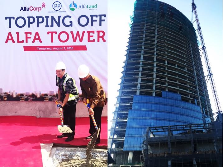 After two years since its groundbreaking, ALFA Corporate Headquarters Tower 1, a 32-storey Green Building was topped-off on the 3rd of August 2016. Mr. Stephen Stinton, PTI Architects' Design Director for Special Projects and Ms. Shakuntala Kartikasari, Associate joined the executives of the ALFA LAND Group and ALFA Corporation to celebrate this occasion, as it marks its place on the skyline of the fast-growing district of Alam Sutera, Tangerang. ALFA Corporate Headquarters was awarded the Five Star Best Commercial High-Rise Architecture in the Asia Pacific Property Awards of 2015-16 due to its meticulously designed functional layout and uniquely curved form that promises to offer high quality office environment with top grade building services and an ESD Gold Rating.